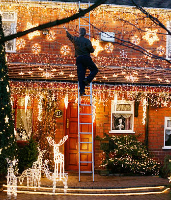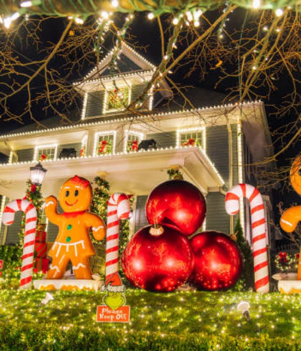 We install roofline lights, wrap trees and shrubs, and set yard figures with timers for easy on/off. Clean, safe, and festive—without the ladder.